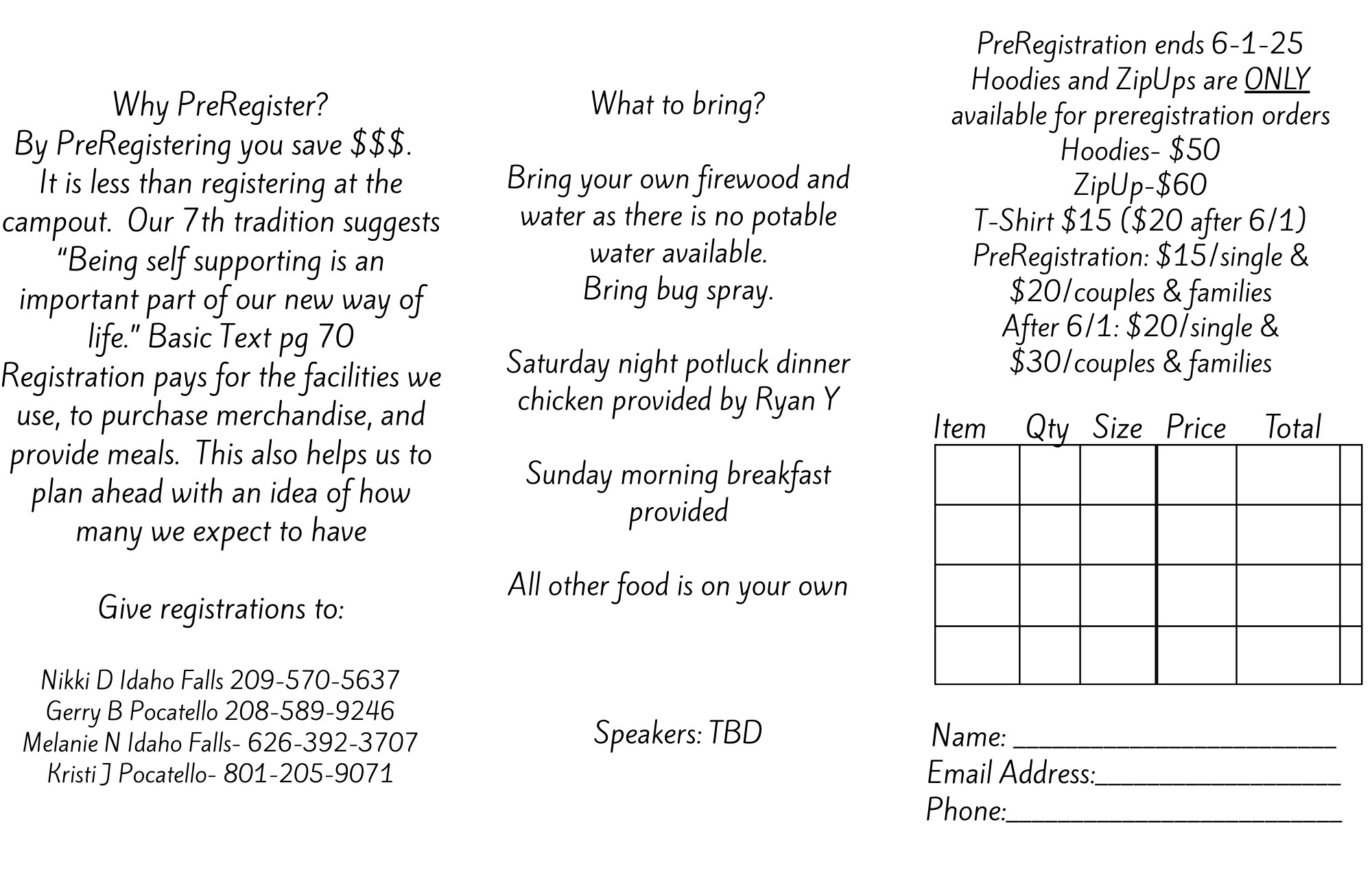 Snake River Annual Campout May 4, 2025 Upcoming Event Campout Printable Flyer Front Campout Printable Flyer Back